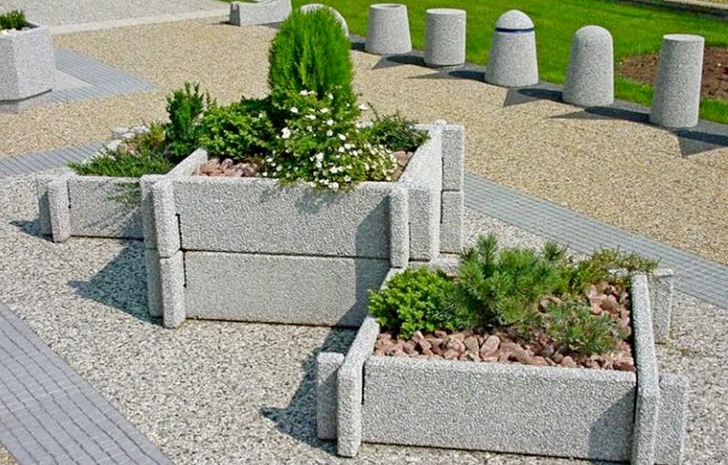 Цветники и клумбы из архитектурного бетонаОт обычного бетона этот материал отличается большей эстетичностью поверхности и возможностью изготовления даже самых мелких деталей. Для этого в смесь портландцемента и наполнителя добавляют специальные присадки – пластификаторы. Они придают бетонному раствору большую текучесть, за счет чего масса легко заполняет некрупные неровности форм для заливки. Цветнику из архитектурного бетона можно придать практически любую форму – округлую, прямоугольную, угловую или квадратную. Размер изделия также зависит только от проекта.
