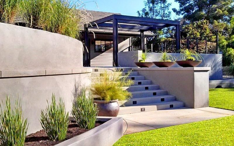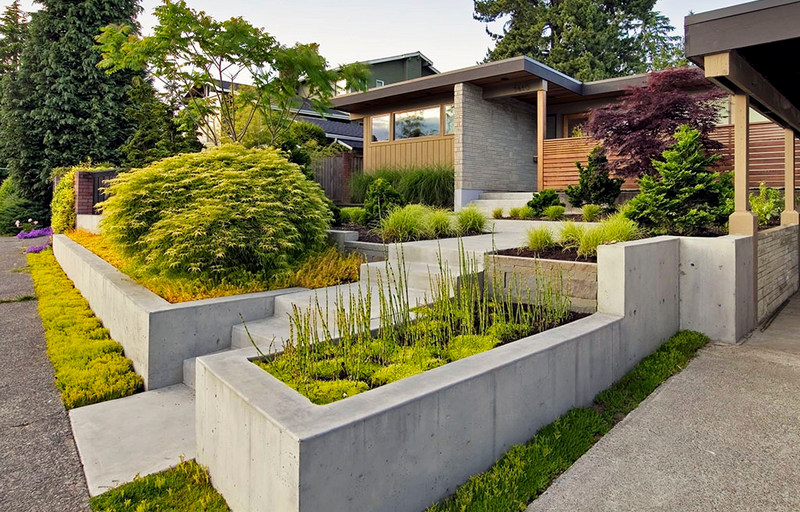 Подпорные стенки используют как надежную и прочную ограждающую конструкцию с долгим сроком эксплуатации. Бетон легко поддается окрашиванию по готовой поверхности в нужные оттенки, возможно придание цвета в массе за счет использования в качестве наполнителя крошки камня различных пород или введения пигментов в раствор.
