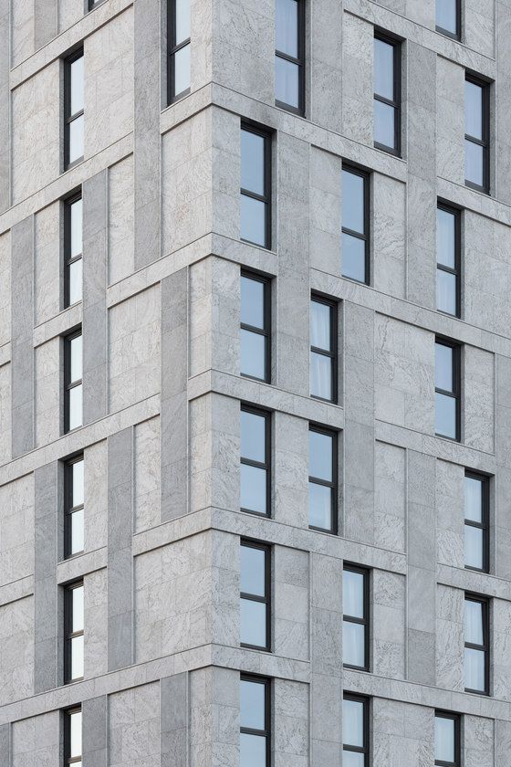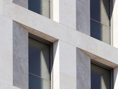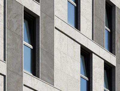 На фотографии один из  примеров облицовки уже готового объекта в Санкт-Петербурге (ЖК на набКарповки, 31).