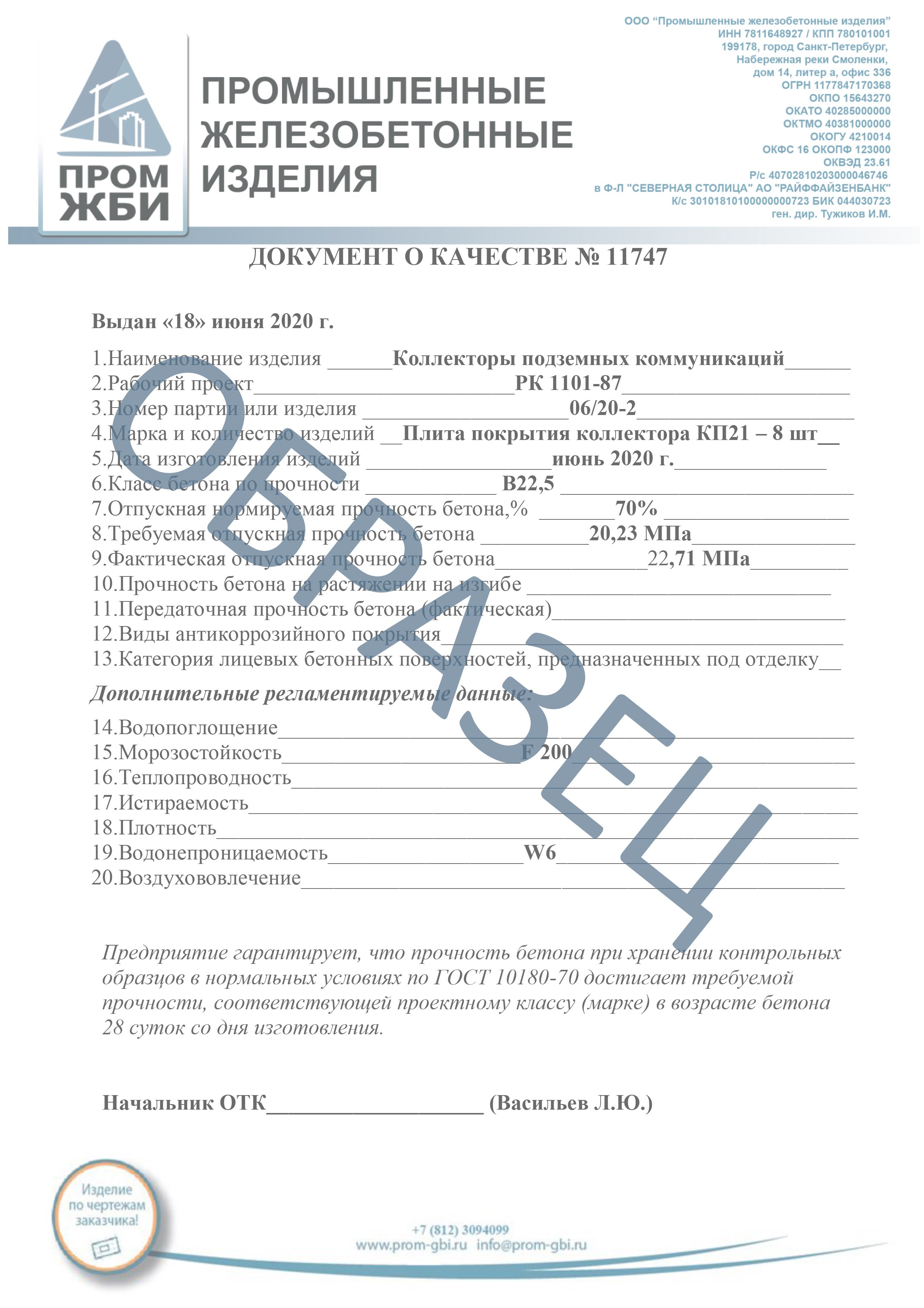 ОТГРУЗИЛИ ИЗДЕЛИЙ с 2008 года: тонн по чертежам тонн по сериям и ТУ тонн из артбетона Паспорт качестваАбсолютно на все изделия, а так же их элементы, производимые заводами "ПРОМЖБИ", разрабатываются соответствующие паспорта качества, в том числе подтверждающие их безопасность. Техпаспорт качества изделия разрабатывается и оформляется в соответствии с требованиями ГОСТ, а так же других стандартов. В компании «ПРОМЖБИ» установлена форма документа. В паспорте указываются: · название изделия, условное обозначение; · сведения о производителе; · дата производства, количество деталей и номер партии; · проектная документация – чертежи, расчеты, планы; · марка и прочность бетона, масса продукции; · номера ГОСТ, ТУ, согласно которым проектировалось и изготавливалось изделие; · сведения о назначении изделия, способах применения; · условия эксплуатации.