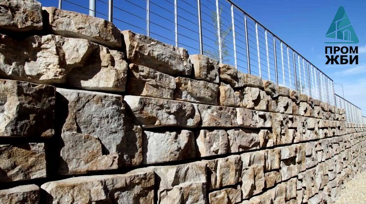 Готовое решение для строительства подпорных стен имеет систему крепления «шип-паз», позволяет быстро возводить конструкции и монтировать сооружение в радиусе 2,28 м. Внешний вид изделий разнообразный. Имеются лицевые поверхности блоков в виде: песчаника, булыжника, известняка и стиля техно. Изделия легко поддаются любым способам нанесения антивандальной защиты - механическому, химическому и термальному. «ПромЖБИ» реализует бетонные блоки подпорных стен. Весь процесс контролируется собственной лабораторией и всем заказчикам выдаётся паспорт качества. Так как в основу входит тяжёлый бетон высокого качества (ГОСТ 26633).