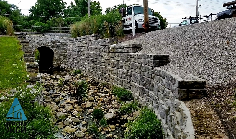 из артбетона Гравитационные подпорные стены в МахачкалеМы производители! Ассортимент - более 50 тысяч номенклатурных позиций для любых cтроительных задач. заказать недорого с доставкой с доставкой в Махачкале, Дагестану и всей России Гравитационные подпорные стены обеспечивают стойкость и надёжность общей конструкции. Мощные опоры своим собственным весом не дают природным массивам обрушиться и обладают эстетическими свойствами. Их строят из специальных бетонных блоков, имеющих соединения шип-паз. На нижней и верхней поверхностях блока предусмотрено не одно, а несколько соединений, что позволяет сдвигать одно изделие относительно другого, увеличивая или уменьшая угол наклона стены. Возможный уклон составляет от 0 до 47 градусов. Бетонные блоки имеют вес от 0,7 до 1,6 тонн, устойчивы к воздействию влаги и других агрессивных факторов. Монтаж не требует дополнительного армирования, и отвес может возводиться в стеснённых условиях. Для сборки обычной конструкции достаточно использовать один подъёмник и двух строителей. Компания «ПромЖБИ» предоставляет заказчикам возможность приобрести гравитационные подпорные стены. Конструкции имеют 4 вида лицевой поверхности, позволяют выполнять радиусы внешнего и внутреннего типа до 2,28 м и гарантирует долговечность конструкции. В собственной лаборатории стройматериал проходит все испытания и клиенту выдаётся паспорт качества.